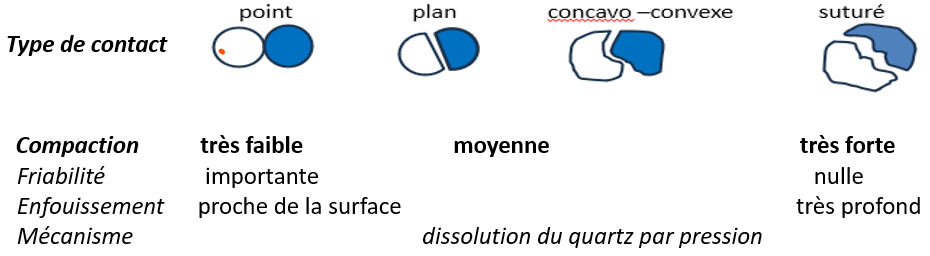 Tout grès cache donc une histoire d’enfouissement et d’immersion dans les fluides circulant en profondeur et avec lesquels il réagit. Le déchiffrage de cette histoire commence par l’estimation du degré de compaction, qui consiste à identifier, en lame mince, les types de contacts intergranulaires définis dans l'image qui suit.