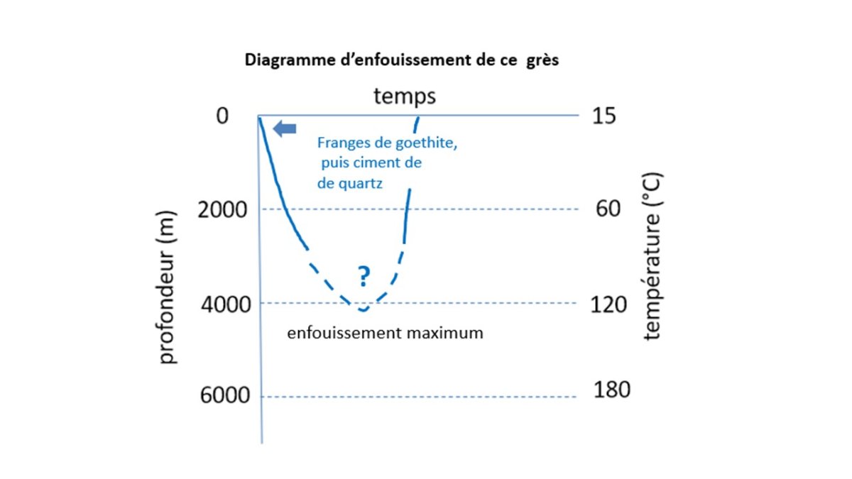 Les minéraux néoformés ayant été identifiés, on en établit la séquence de leur formation. Celle-ci est révélée par leurs inter-relations spatiales et par leurs relations avec le degré de compaction (i.e. formation avant ou après un certain degré de compaction). A cette séquence minéralogique correspond évidemment celle des conditions physico-chimiques (enfouissement/profondeur maximum, température, pression, pH , Eh, pression de CO2) qui ont dicté le cours des transformations, physiques et chimiques du grès, et partant de leurs propriétés économiques telles que porosité, perméabilité, densité, etc. La profondeur maximum peut-être estimée grâce à des paramètres qui varient en fonction de la température/profondeur atteint. Parmi ceux-ci on peut citerla cristallinité de l’illite (degré de perfection cristallographique), l’assemblage minéralogique, la vitesse du son dans le grès, la densité des argiles voisins, la réflectivité de la vitrinite (un minéral du charbon).