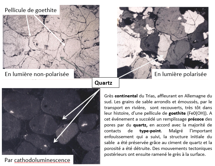 -formation précoce de ciment ou d’excroissances d’hématite/goethite, calcite et dolomite, quartz, minéraux argileux (kaolinite, glauconite)